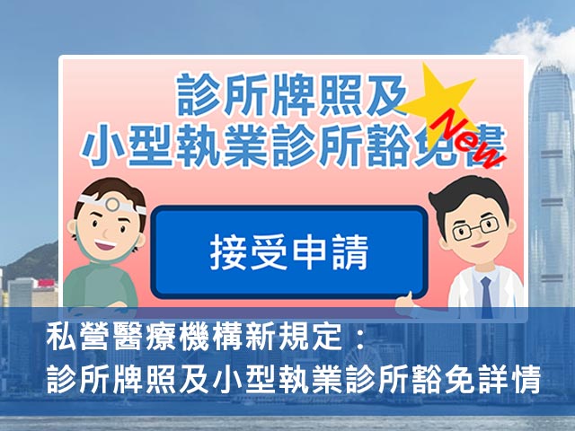 小型執業診所豁免書:符合特定條件的小型執業診所可獲得豁免,這些條件包括診所必須由註冊醫生或牙醫獨自營辦,並且不容許有分租情況。