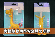 | 海關提醒家長立即停止讓嬰兒使用一款牙膠,指其末端部分體積過小,容易深入嬰兒喉部,有機會導致嬰兒窒息,未能符合《玩具及兒童產品安全條例》的一般安全規定。 海關也發現另外兩款嬰兒牙膠未能完........ | |