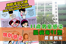 | 衞生署衞生防護中心今日(十一月七日)正調查一宗腸病毒71型感染嚴重個案,並再次呼籲市民和院舍時刻注意手部、個人和環境衞生。 該名11歲男童過往健康良好,自十月三十日起出現發燒、咳嗽........ | |