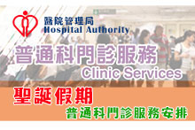 | 醫院管理局(醫管局)今日(2018年12月23日)提醒市民,在聖誕假期期間(12月25日及26日),醫管局轄下12間普通科門診診所將會如常服務市民,求診人士可如平日般透過電話預約診症時間。另........ | |