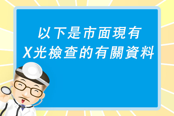 市面上有以下醫療機提供服務:香港仁和體檢、博思醫學診斷中心、領先基因、香港國際醫療中心、盈健醫療、全仁醫務中心等等。服務收費由$450至$66000不等。X光檢查